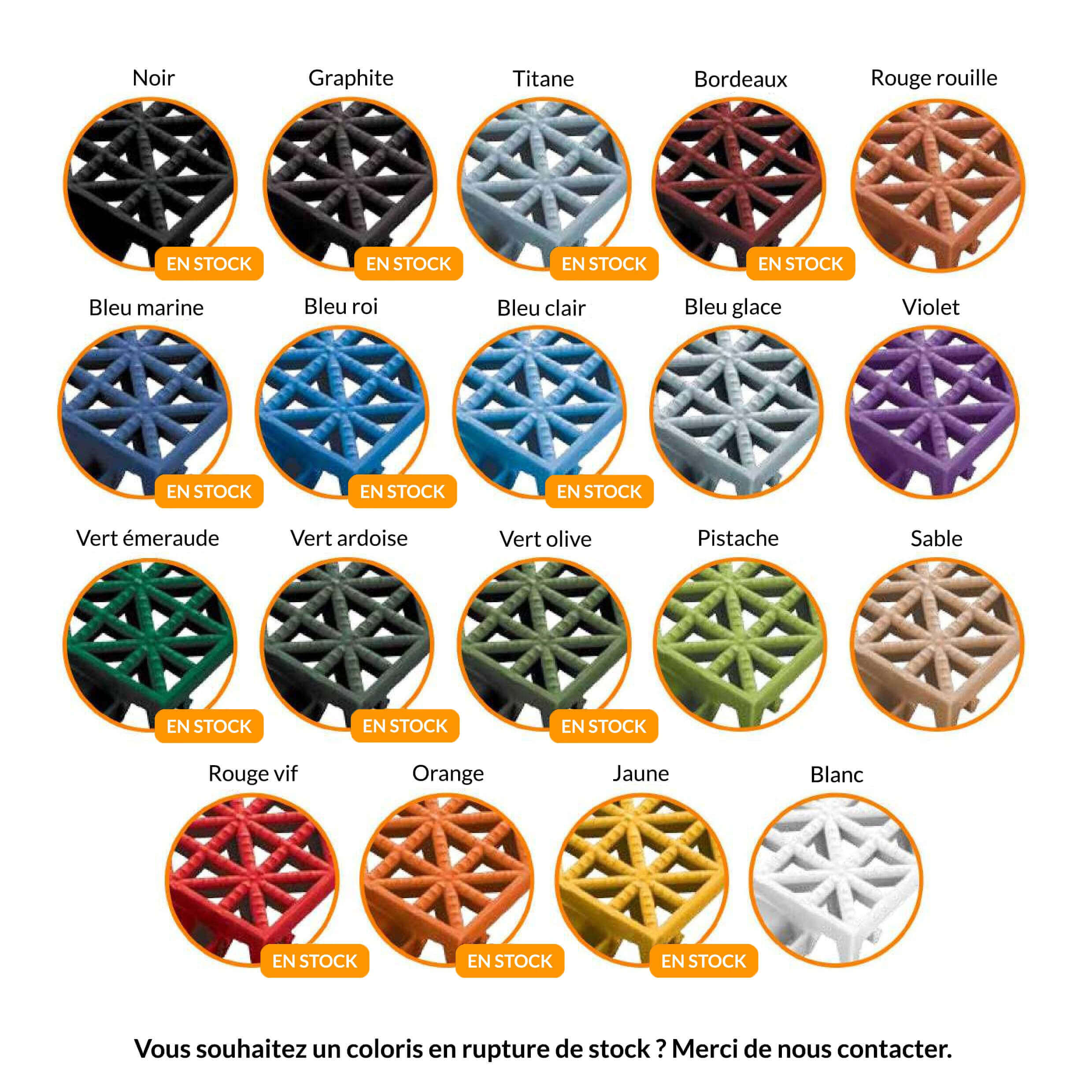 Titane / Graphite / Noir / Bordeaux / Rouge / Orange / Jaune / Bleu Marine / Bleu Roi / Bleu Clair / Vert Emeraude / Vert Olive / Vert Ardoise