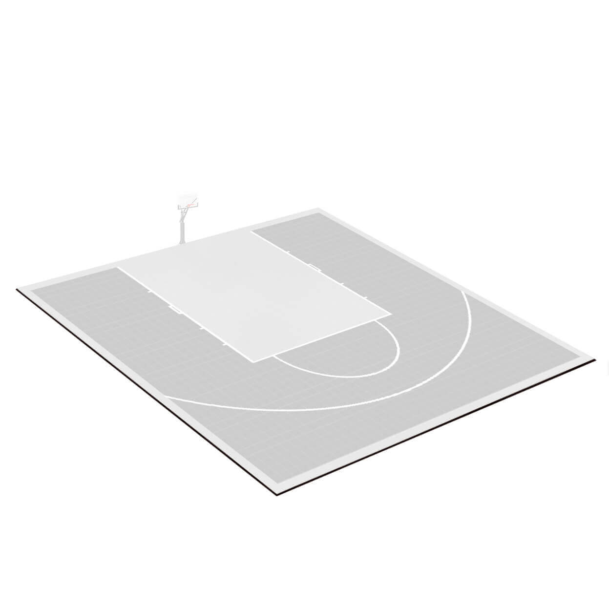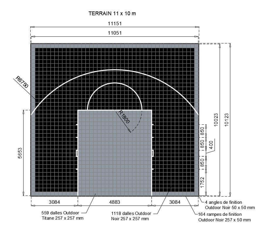 - Un terrain de basket 10m x 11m avec marquage des lignes de jeux (Blanc), personnalisation possible sur simple demande avec 1 ou 2 choix de couleur(s) pour le revêtement sportif.