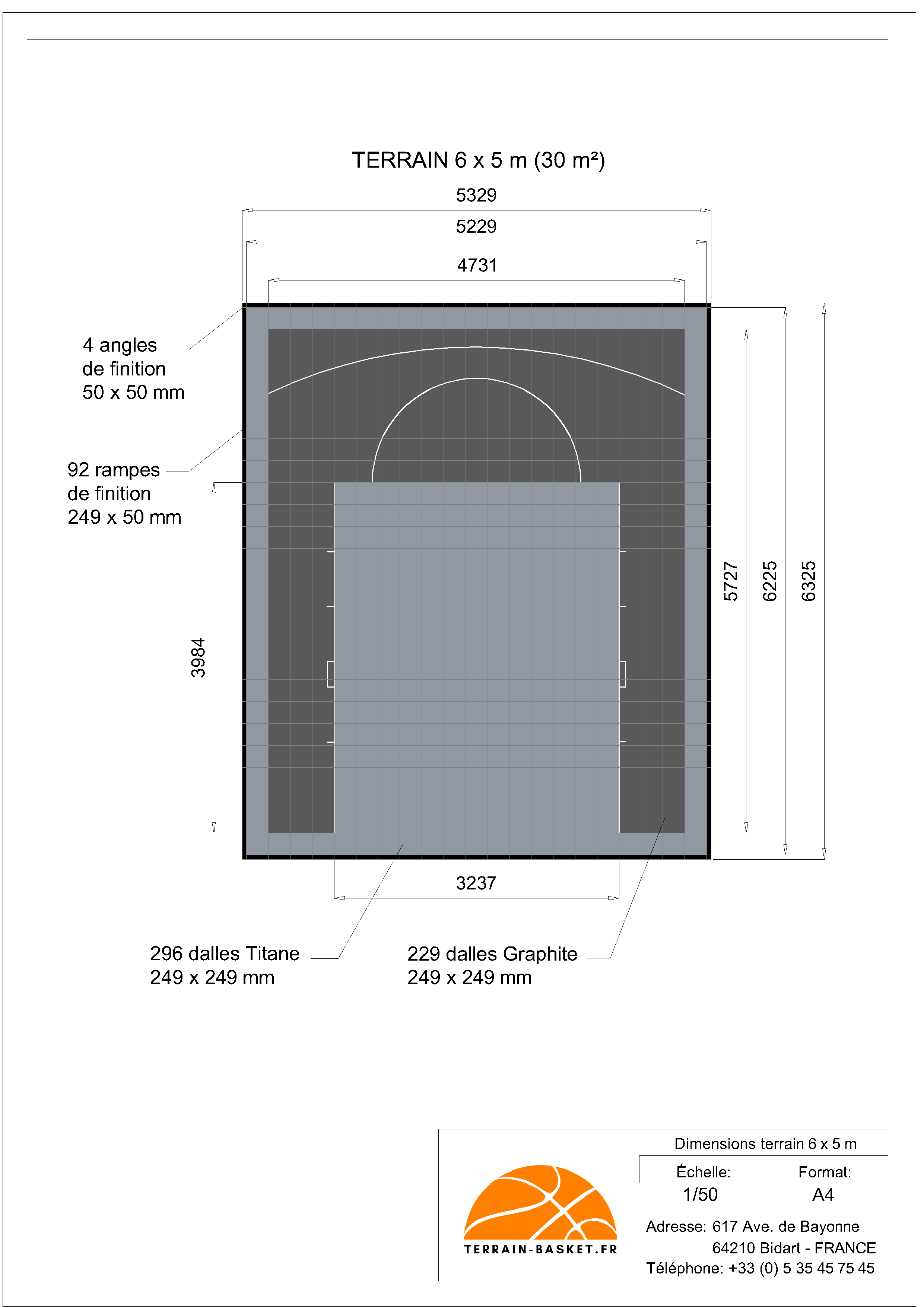 - Un terrain de basket intérieur 6m x 5m avec marquage des lignes de jeux (Blanc), personnalisation possible sur simple demande avec 1 ou 2 choix de couleur(s) pour le revêtement sportif.